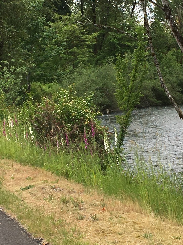 One other HUGE benefit from the motorhome moving on – with the camper off the truck we have been able to take The Bike down to ride the Cedar Creek Trail every morning this week! Wild foxglove, daisies, blue eyed grass, wild roses and grapes, buttercup and coltsfoot are all in bloom between trail and river!