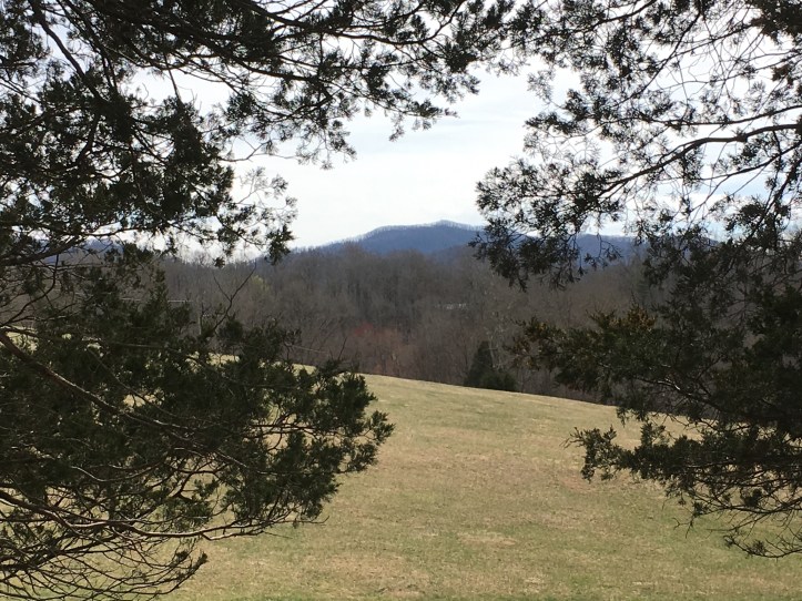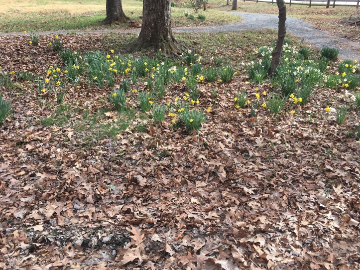 The view from my home office window – rhodedendrum, pie cherry, & forsythia in bloom. Bramble canes of raspberry overtaking the bench! The highbush blueberry in leaf behind the cherry. Life is Good! We walk the dirt road we live on every day with the dawg!
