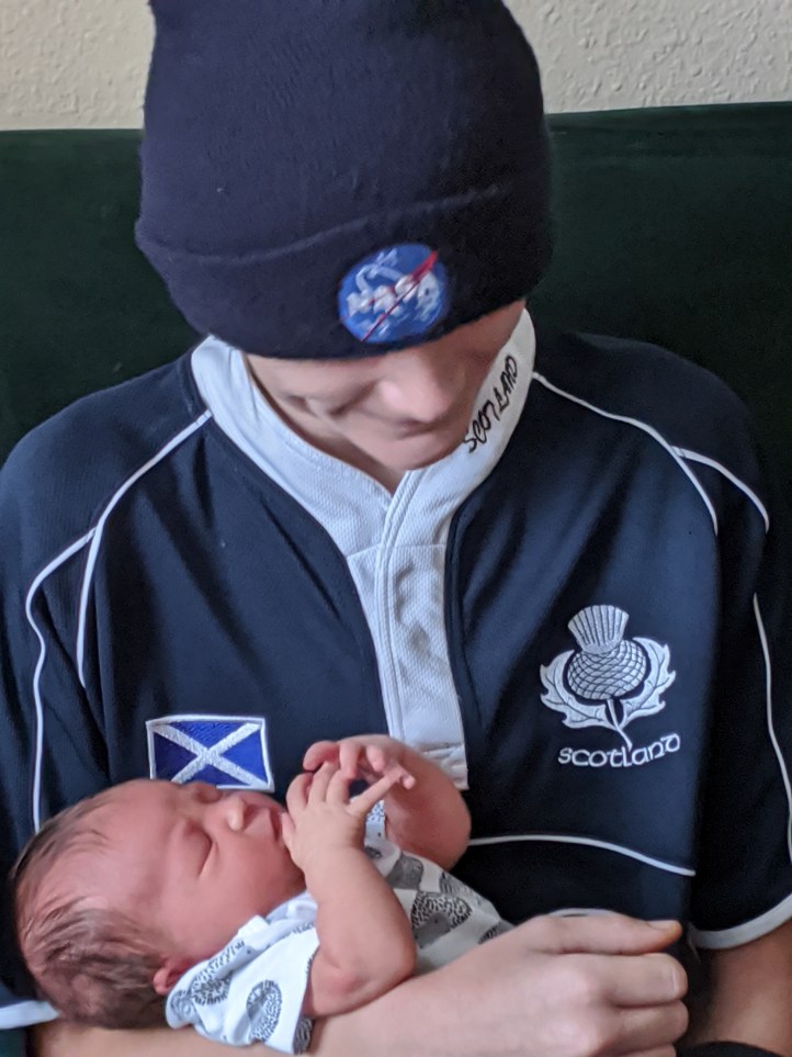 Fortunately the pack of Covidiot cyclists from yesterday were nowhere to be seen. While on our 4 mile stroll I got a text from my brother Charlie with a photo of his grandson Tavish holding his new baby sister Carys!