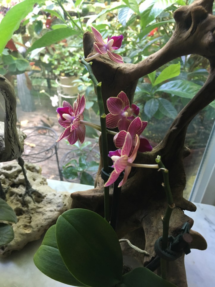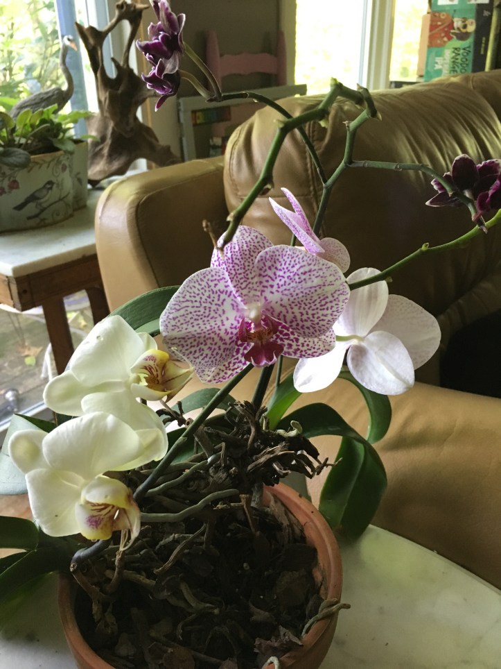 Makes for happy orchids! These burst into bloom on the deck and have come inside to be enjoyed!