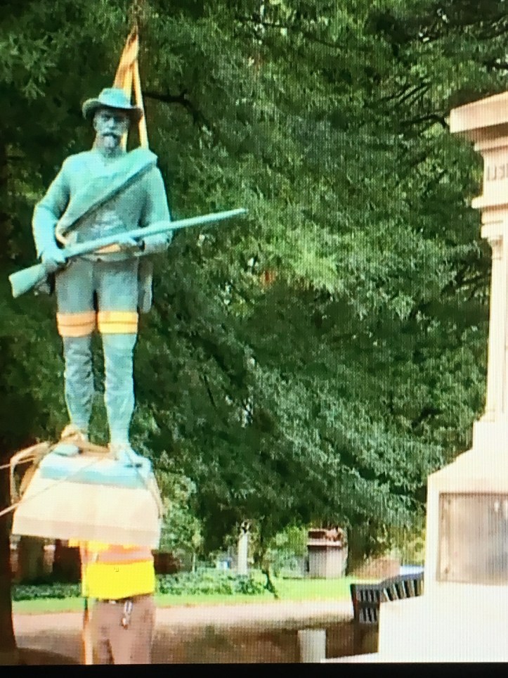 The Confederate statue in Court Square – “At Ready” – is being removed.