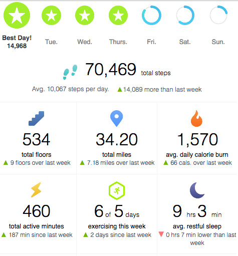 We’ve been thoroughly enjoying our morning walks, ~five miles a day! Pretty sure those walks get credit for the amazing weight loss! I am thrilled to report that I have lost fifteen pounds!!! My small framed 5’4″ self had “blossomed” to 126 pounds – for reference I only weighed 124 when I arrived at the hospital to give birth to Josh. Very, very pleased by this! Here’s last weeks fitbit report: