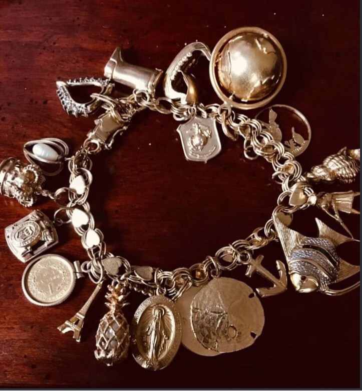 I wore Mothers beautiful gold charm bracelet. It has antique movable charms, like a boot that opens to have a Santa pop out! A lady golfer who swings her club! It has the Eiffel Tower mom bought when I took her to Paris for a long weekend, and a crown she bought when Charlie & I took her to England, Scotland, and Wales! An anchor to celebrate Josh in the Navy, the USMC charm for dad, her high school emblem. So many memories!