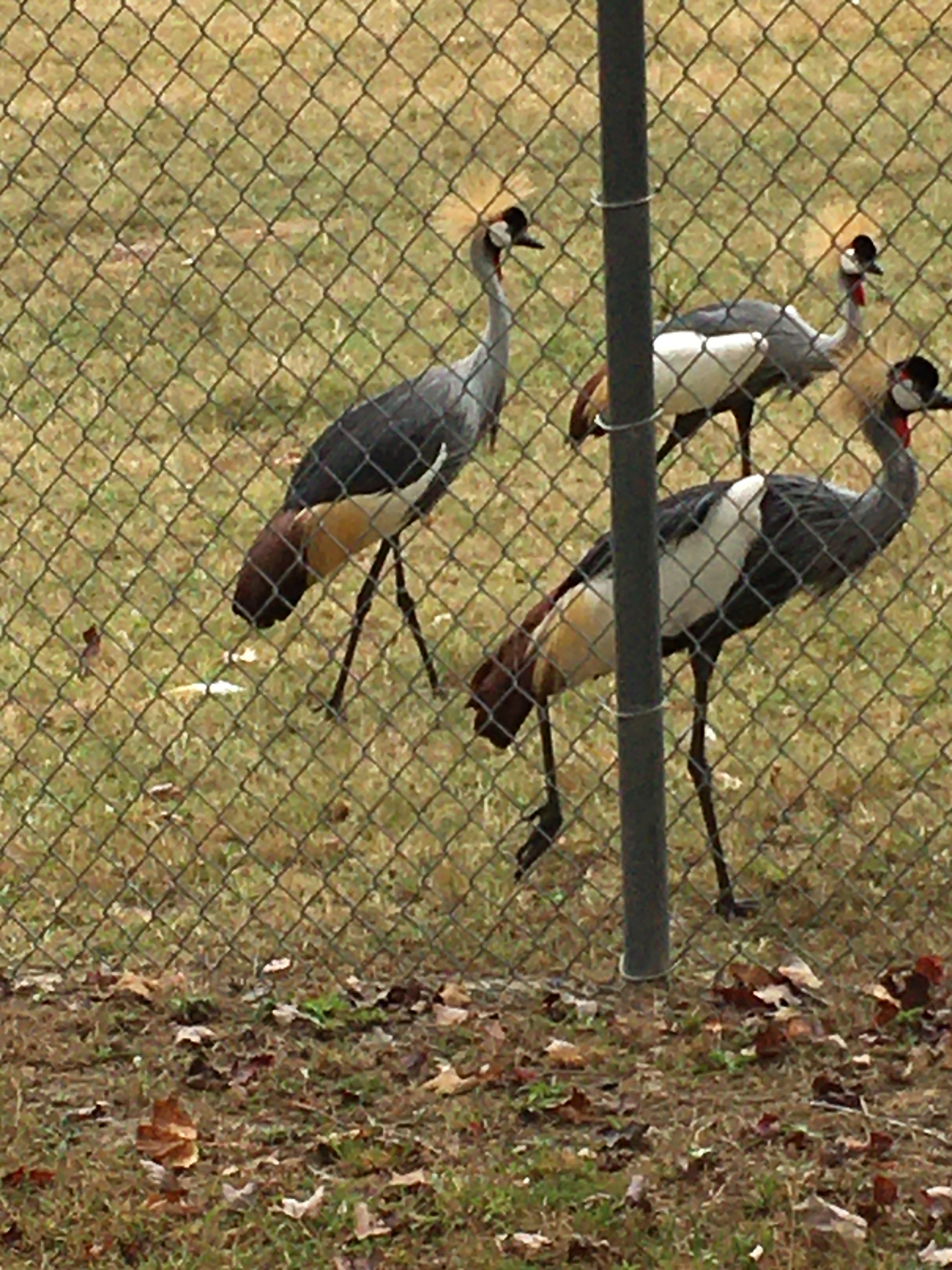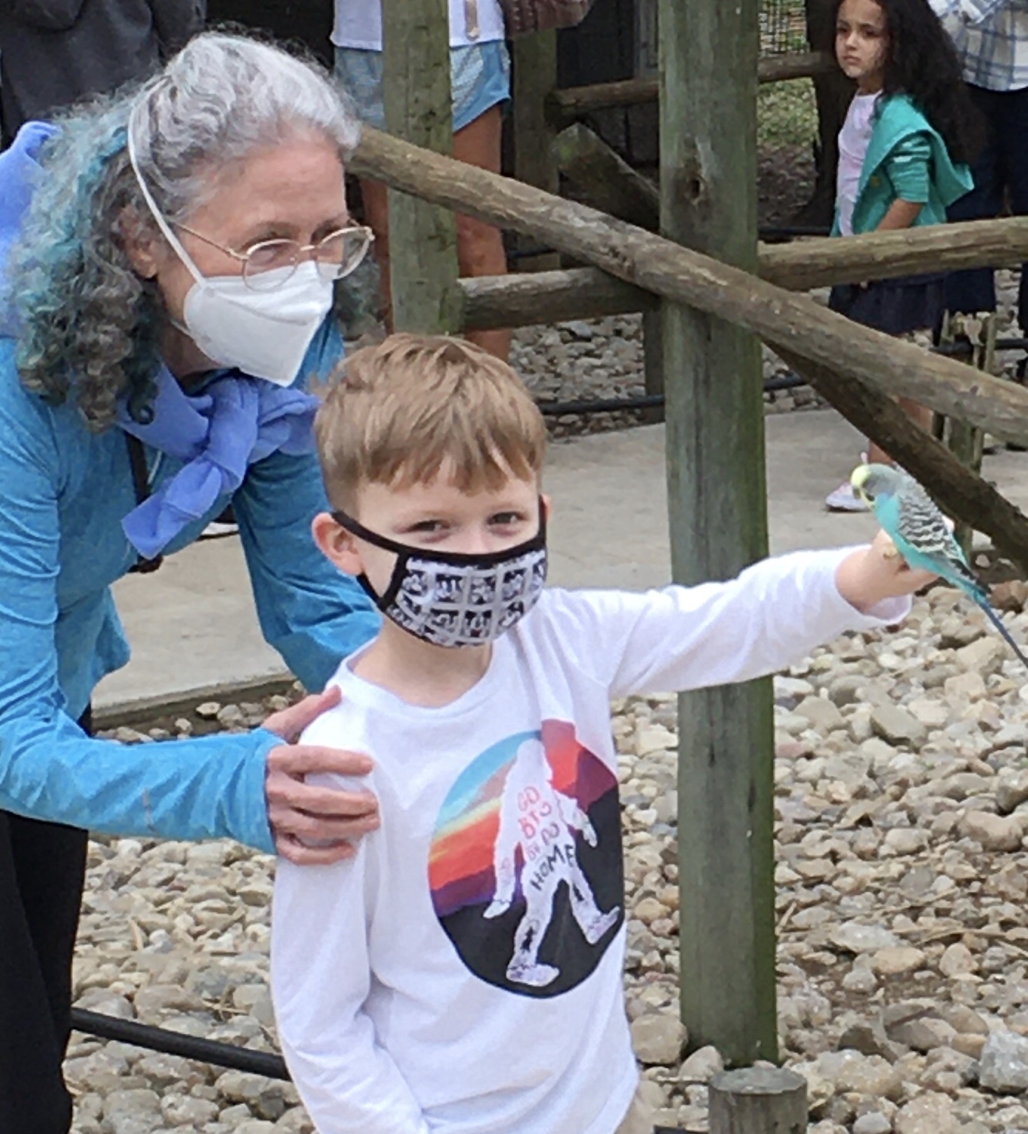 He & I went into the budgie habitat and were able to convince a teal colored budgie to sit on our stick – the bird was nicely color coordinated with Grandma’s hair!
