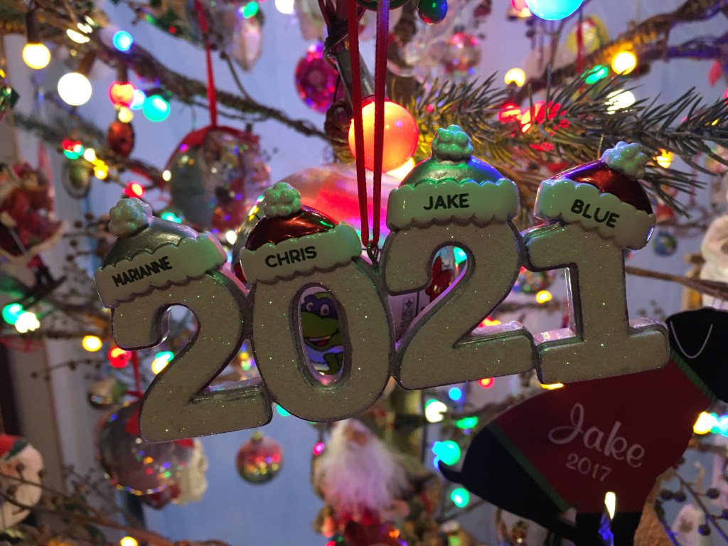 When we arrived home a package was waiting… Chris had ordered me the perfectly apropos ornament for the second year of the pandemic. The four of us – Chris, me, Jakie and of course Blue! Love it!