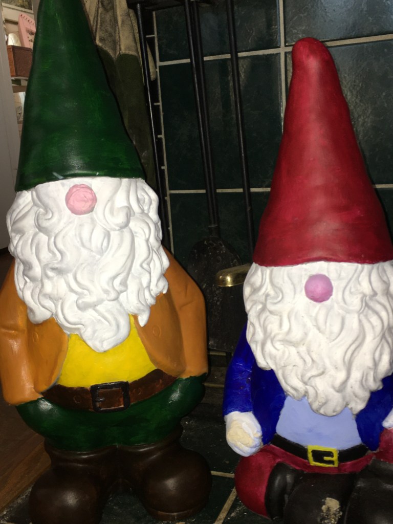 When we got home I broke out the putty & paints to repair & refresh Cousin Larry’s garden gnomes. Looking pretty spiffy if you ask me! And right at home on my hearth too, hmmm…!