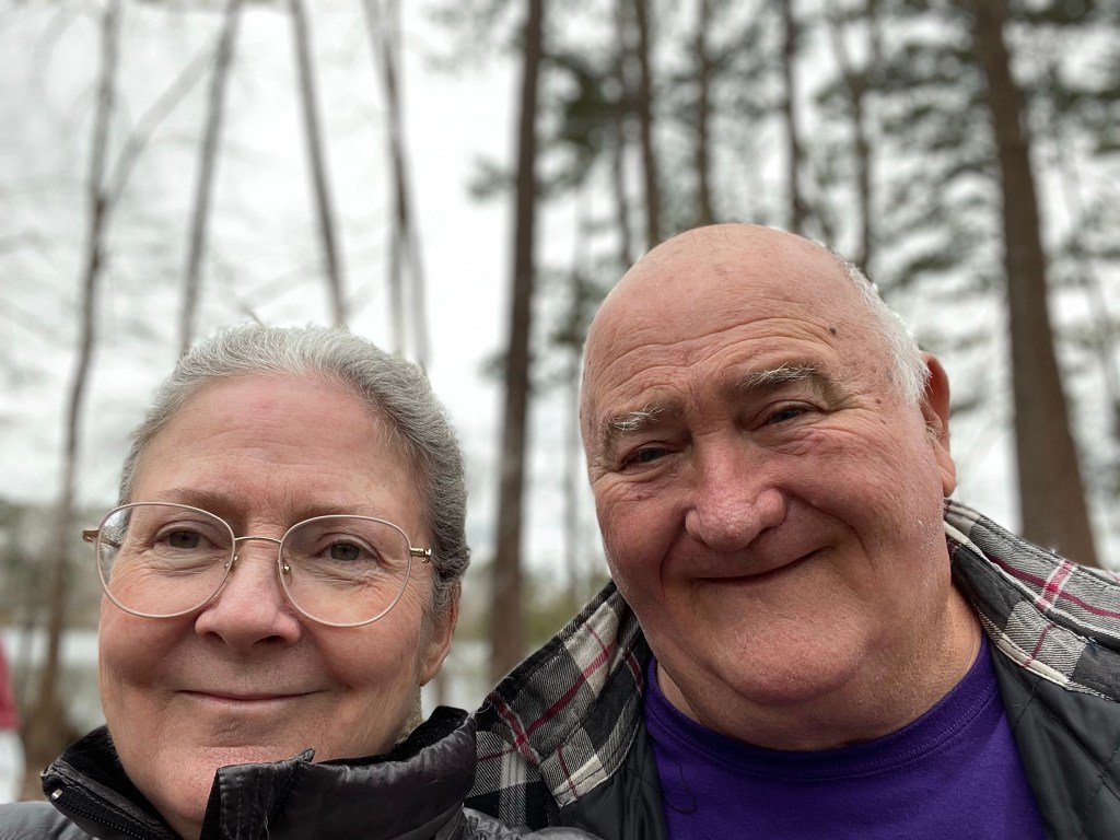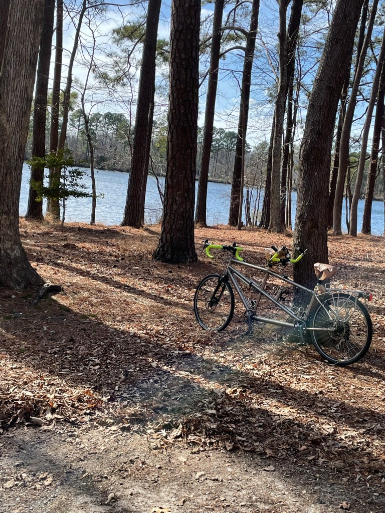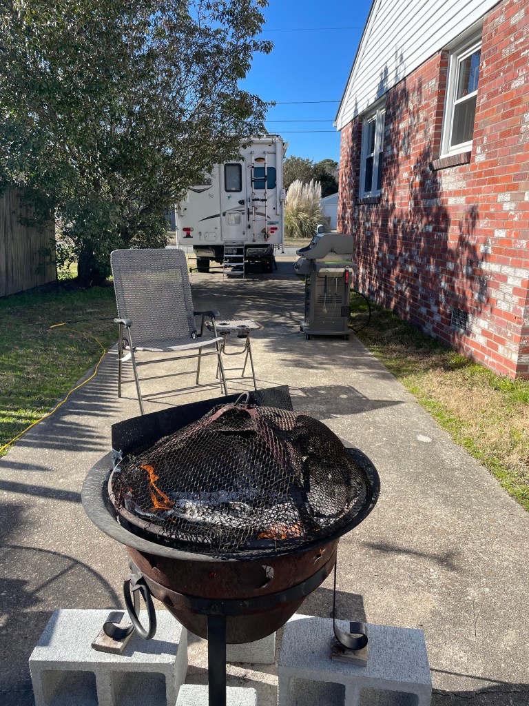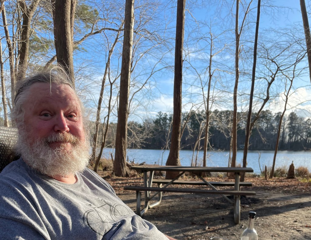 February 17th. It’s the Lizard’s last year as a young’un since he turned 59 today! So we loaded up The Bike, decked out the camper & hit the open road! Three (our magic number!) nights at Newport News city campground are on the schedule, then one night camping at Cousin Larrys place with a birthday bonfire while playing “Shut the Box”! It’s a balmy 74 degrees here at the campground with a lovely breeze & cornflower blue skies!