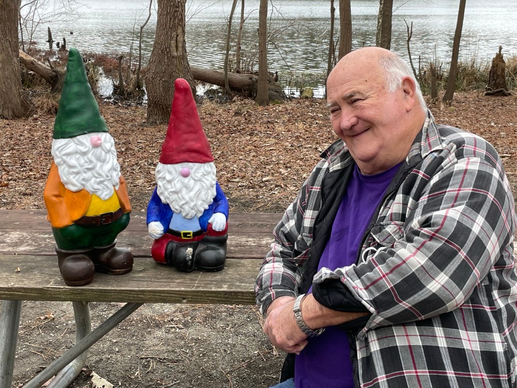 After enjoying our lunch, completely satisfied, we returned to the campsite where Larry was at long last reunited with his gnomes. Alas, they had looked SO cute on our hearth…