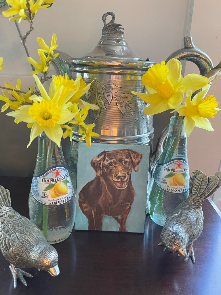 Our friend Chris Baldwin dropped by to dig some forsythia & lilacs, & bring us a couple volunteer holly trees. He also brought the paintings of Jakie that we commissioned from his daughter Rebecca. Simply perfect!