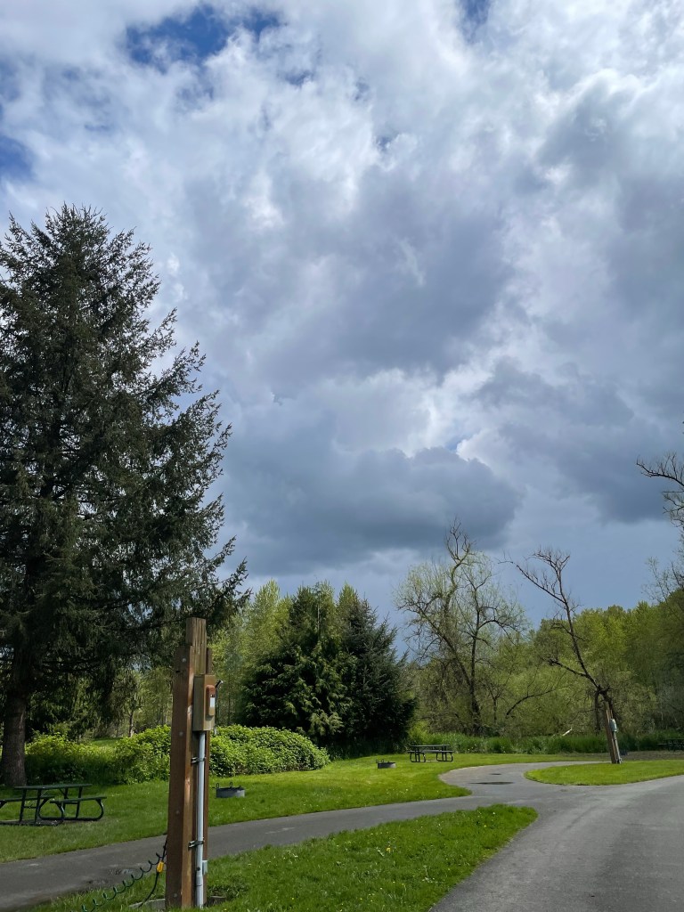 We arrived at Tolt MacDonald park in Redmond late Thursday afternoon to find the paved part of our site was flooded(!) Apparently the site was also too wet to mow, as our grass was way longer than the rest of the campground too. The cold wet weather we’ve experienced throughout this trip continues to haunt us but at least we’re cozy & warm in the camper!