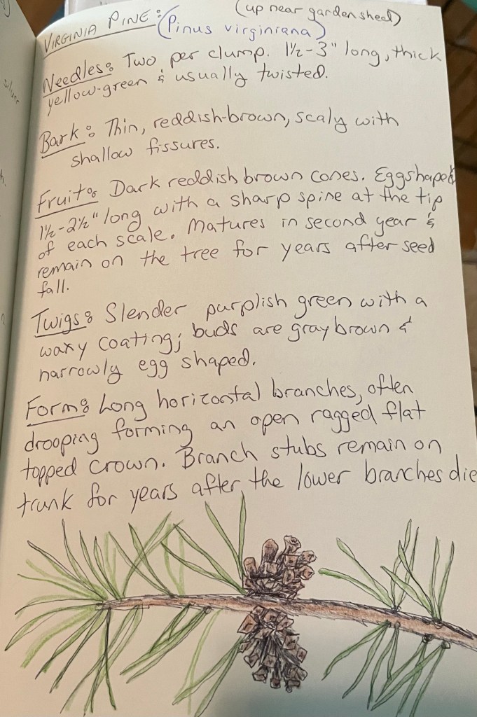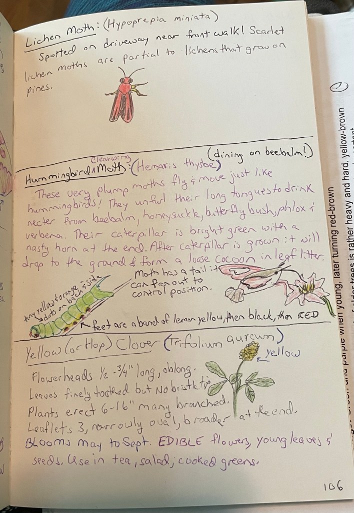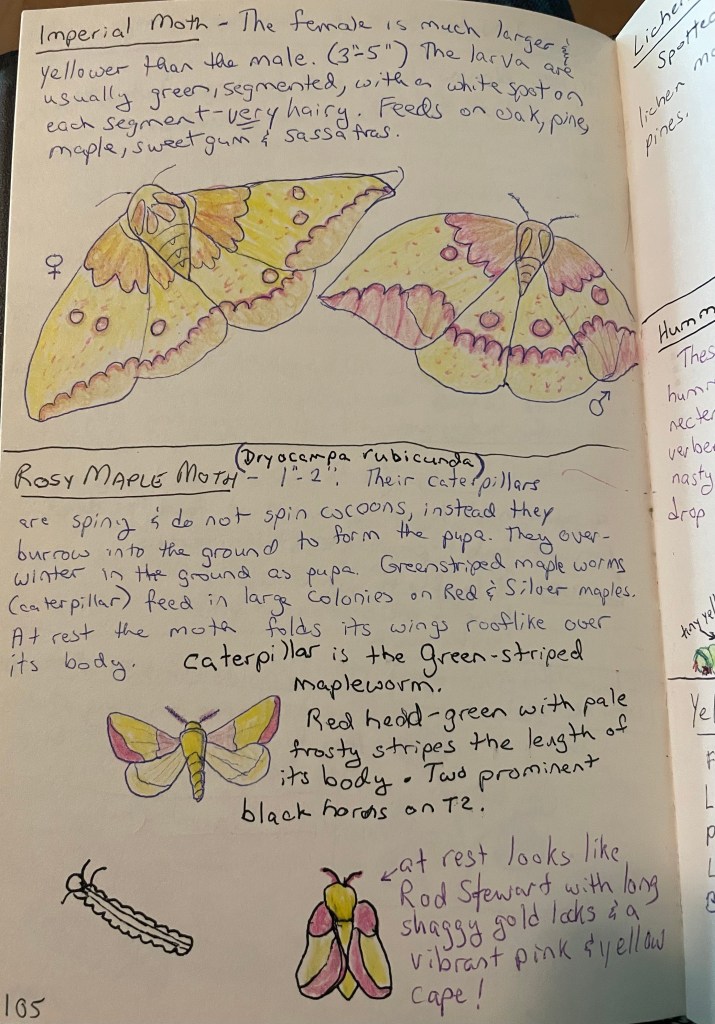 The Nature Journal I began in August 2008 is still growing! I began adding color to my sketches a couple years ago. I used to devote a full page to each species when I started but as pages began running low I upped it to two per. But now having filled 165 pages (with only five pages left in the book) I’m very simply annotating six per page.