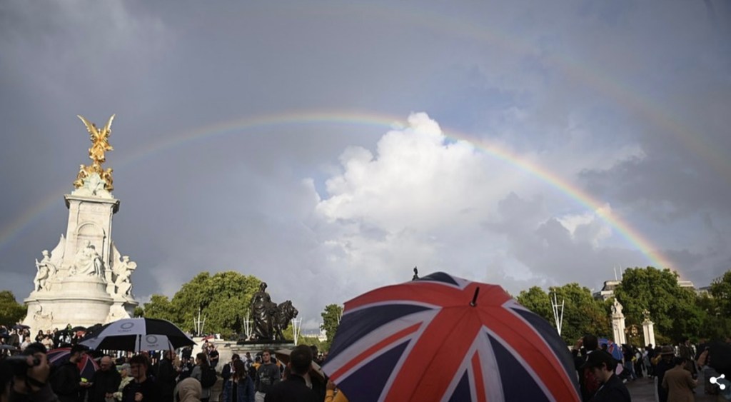 Once the Queens death was announced, the skies cleared and rainbows appeared over both Balmoral and Kensington Palace! Beautiful bridges to heaven for Her Majesty.