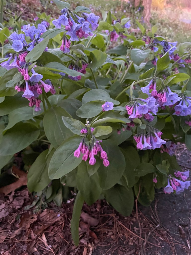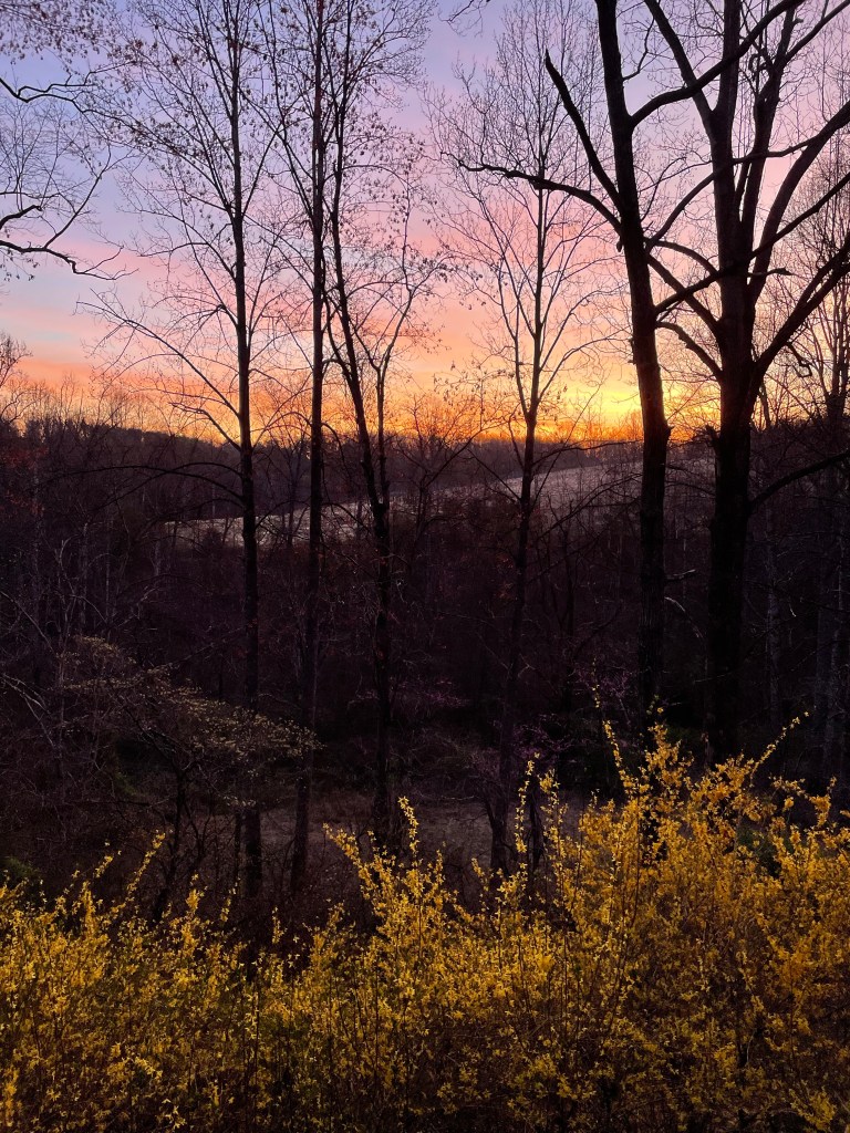 We had a magnificent spring sunrise with its lovely chorus of bird song this morning. Robins, cardinals , eastern phoebes, wild turkey, bluebirds, carolina wrens, & dark-eyed juncos all sang as the little woof & I walked on the driveway admiring the masses of Virginia bluebells, & forsythia. Wild cherry blossoms drifted on the breeze. Simply stunning!