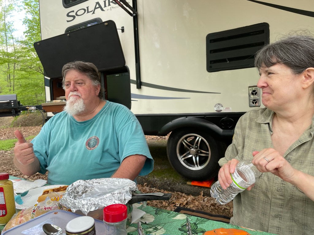 Friday afternoon – loads of laughter & lots of fun! First Debbie & Leo joined us (inside our camper due to rain) to indulge in crab salad, grilled shrimp cocktail, & caprese salad – delish!