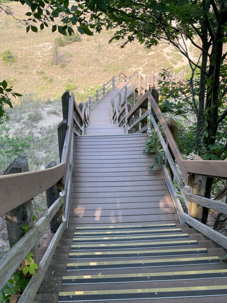 We hiked the West Beach Diana of the Dunes trail. We were a little dubious when we saw the massive wooden steps, because while UP is not a problem little T Rex has been too terrified to go DOWN steps and this would be a LOT of steps to carry him down…