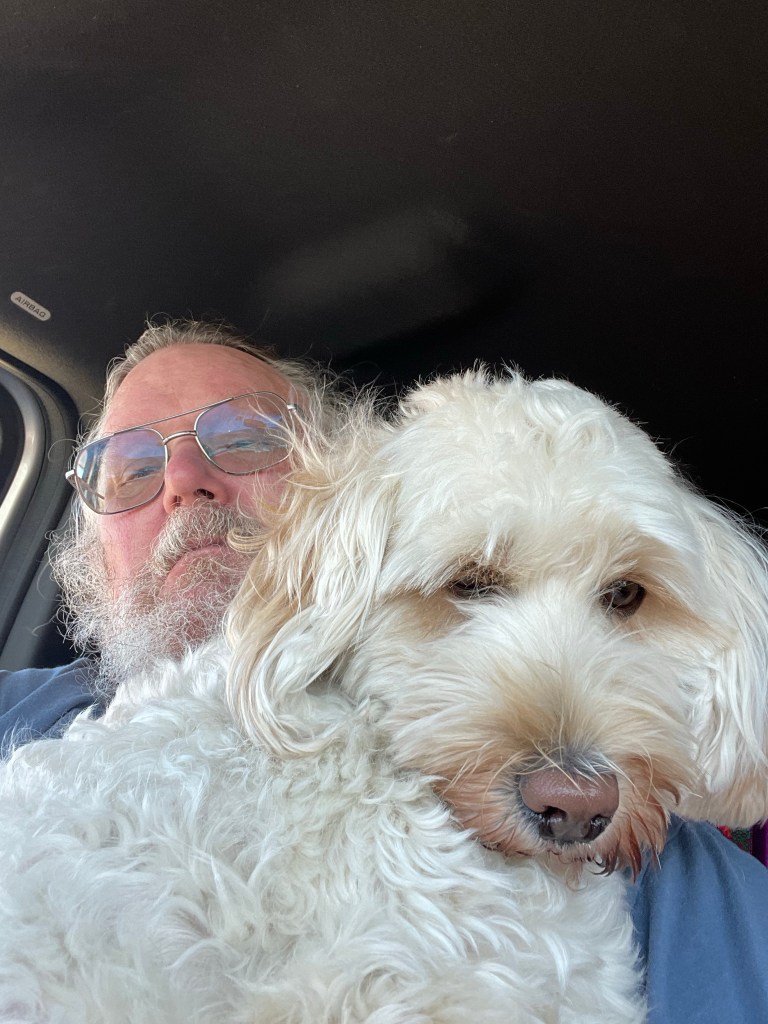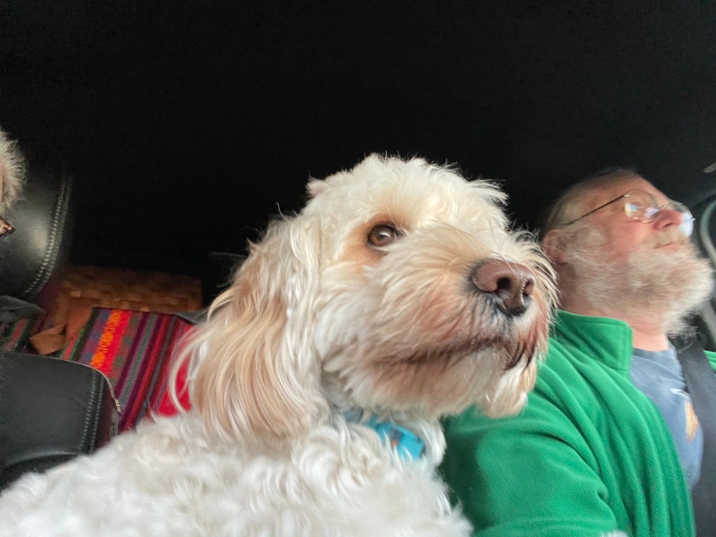 The next day we tried to keep him in the back seat. Utter.Complete.Failure!!! Pupster crawled over behind Chris in the passenger seat. Initially he slipped his paw over Chris’s right shoulder…