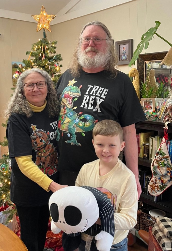 Christmas Eve, with cozy matching pajamas & Grandma Mel in festive xmas cats from outerspace fleecy overalls! Of course a few gifts *had* to be opened!