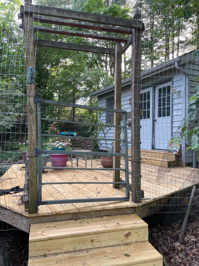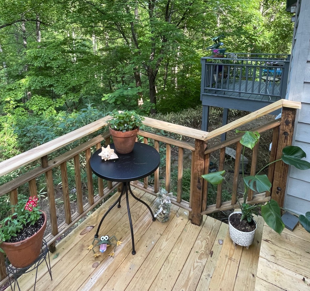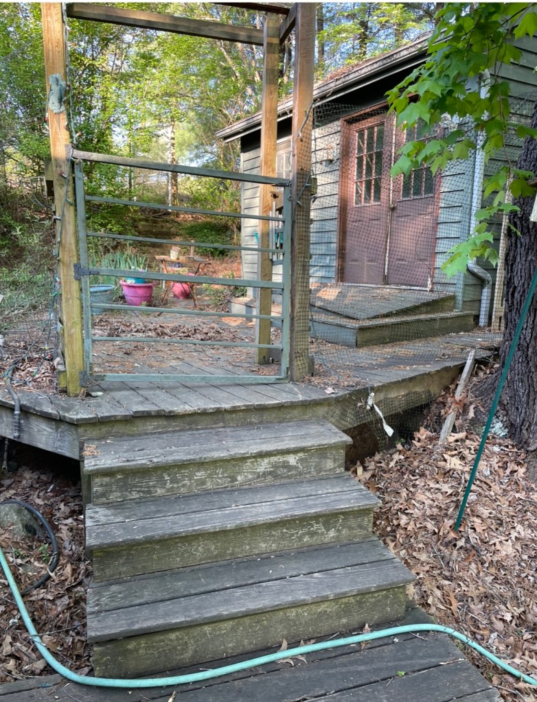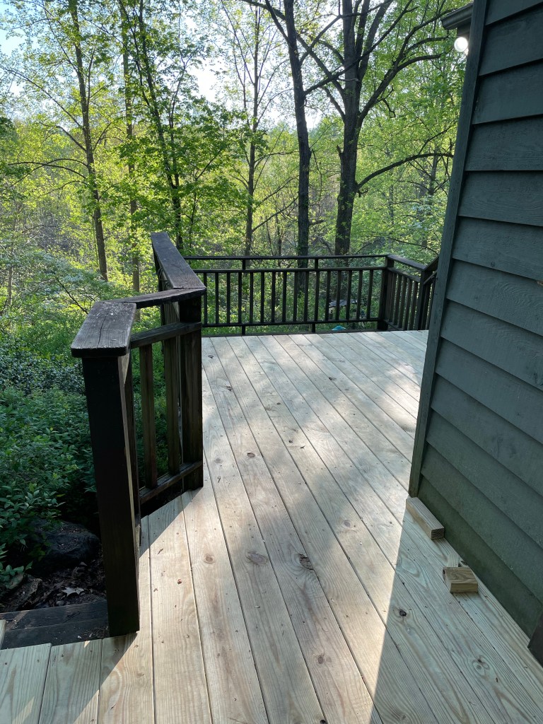 We’re cleaning up some long needed “deferred maintenance” this spring. First up was replacing the front deck, which was collapsing in front of the bike house.