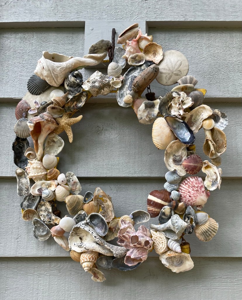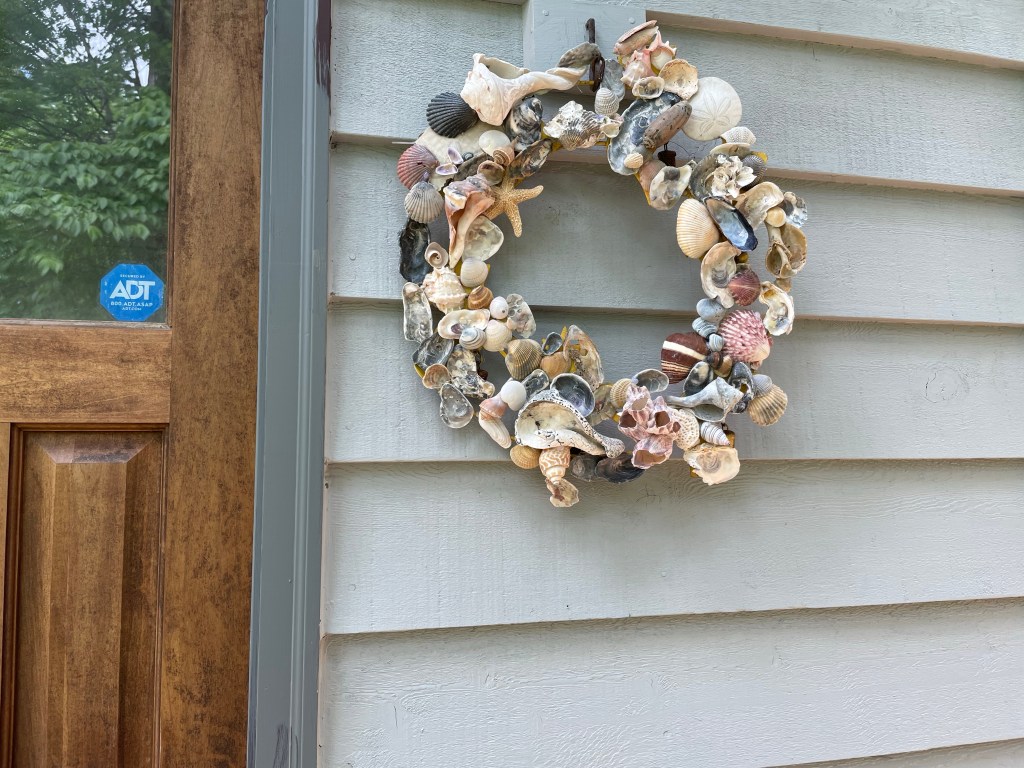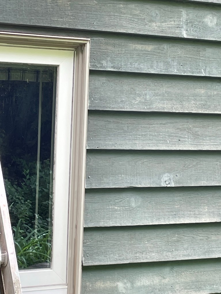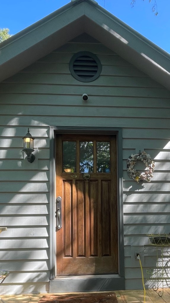 After the deck was built it was time to caulk and stain the cedar siding. I’ve chosen a lovely pale blueish gray stain for the house and a deeper blue gray for trim and deck.