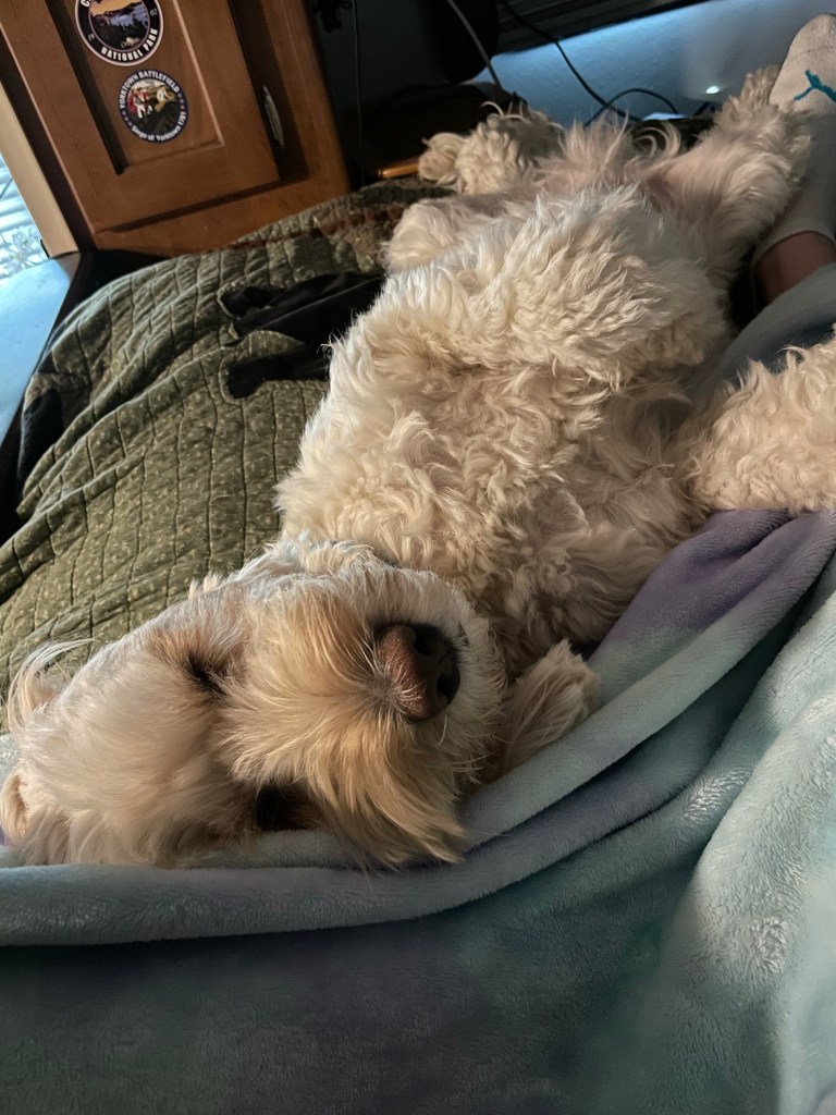 Our boys love life in the camper! They prefer early morning walks before the brutal heat. But they adore snuggling & sleeping in!