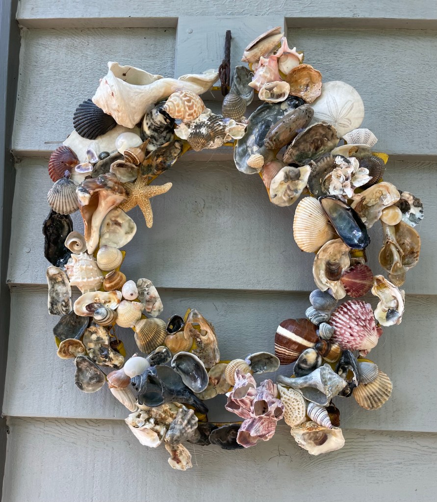 Oh, I had the idea to spray clear gloss rustoleum paint on the wreath to make the shells colors pop out like when they are wet… Total success!!!