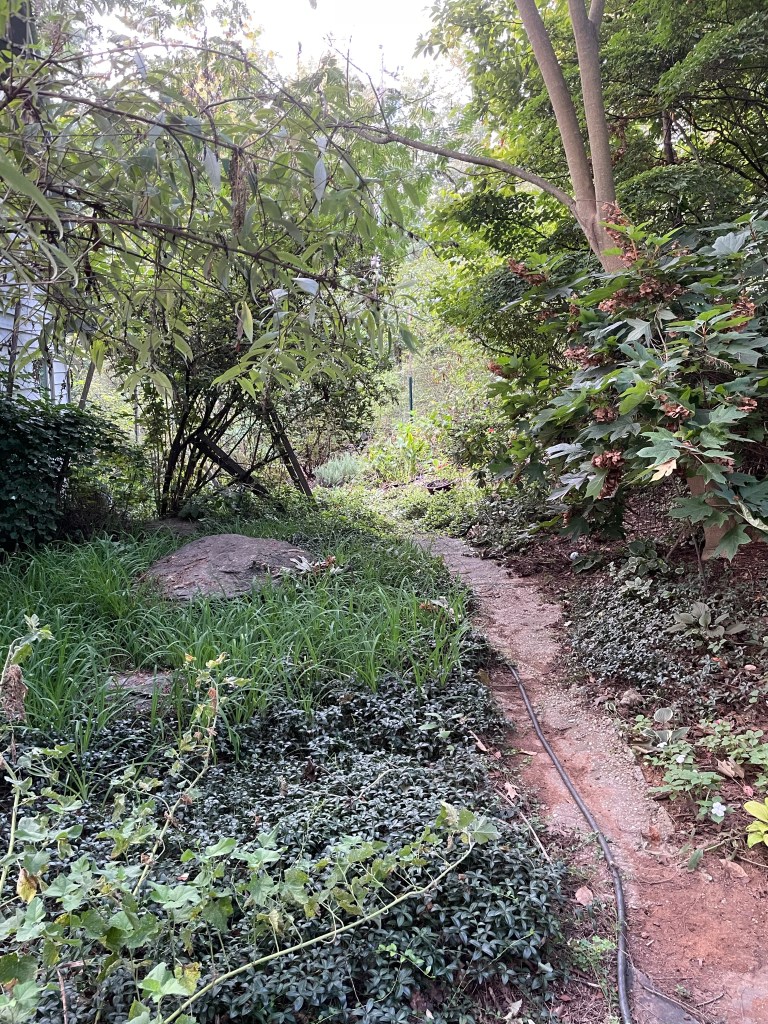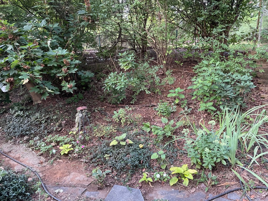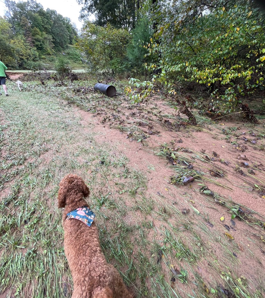 The heavy rain bands of the remains of Hurricane Debby struck Virginia Friday August 9th as a tropical storm. We didn’t think much about it as our home is ~120 feet above the Mechums river. Apparently we had over 11″ of rain that night, the upstream runoff of which caused the river to come out of its banks by about 120 feet, inundating over 1/2 of our lower meadow! It flattened the 8 foot tall wingstem, thistles, milkweeds and deposited several inches of silt which buried the grass peace path!