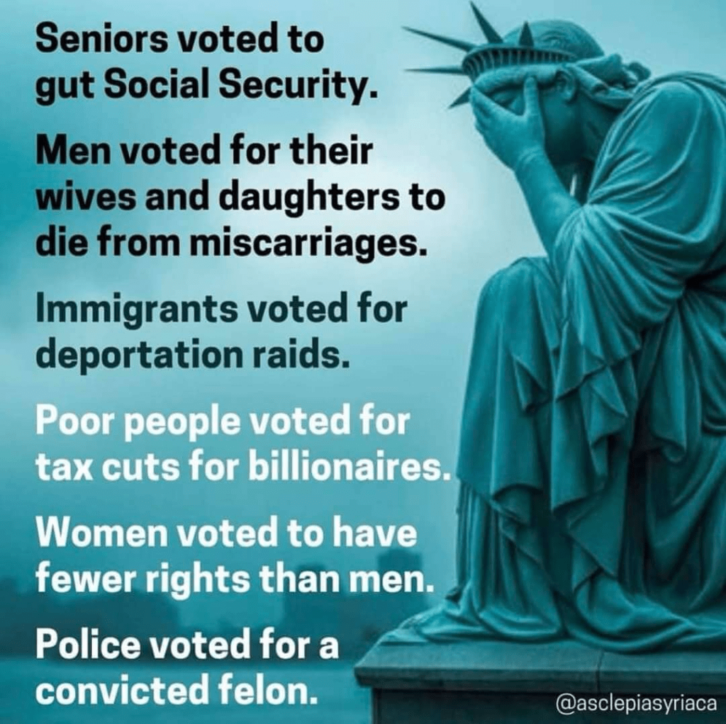 It is over. America is gone. The ignorant racist misogynists have won, My country is lost. The bright light on a hill, as Reagan once called America, is extinguished. Trump has finally finished the execution of America that Reagan started so many years ago.