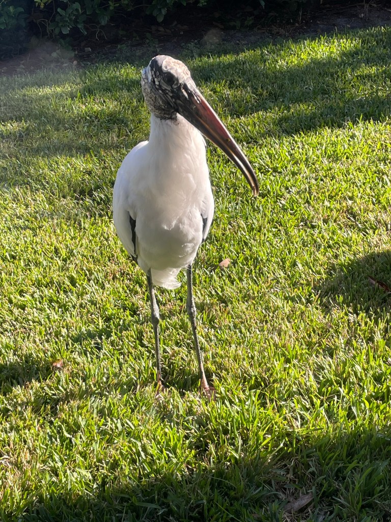 Our first night in Florida featured a fantastic snow crab feast! The following morning Woody the Wood Stork showed up for snacks.