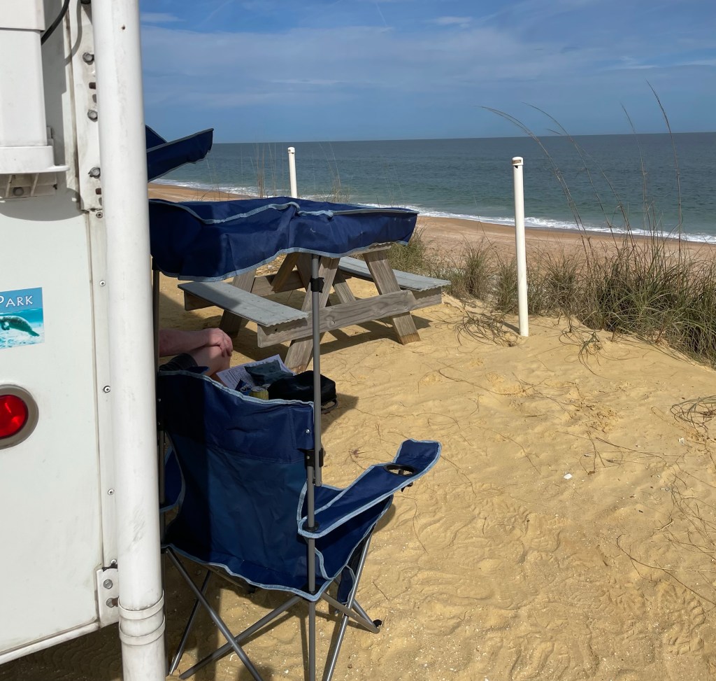 Monday morning we met John & Nancy for breakfast at Hi Tulip cafe! Then on to Treasure by the Sea in Flagler Beach for two nights of sheer heavenly bliss! Site 19, nothing but sea grass and sand between us and the ocean!