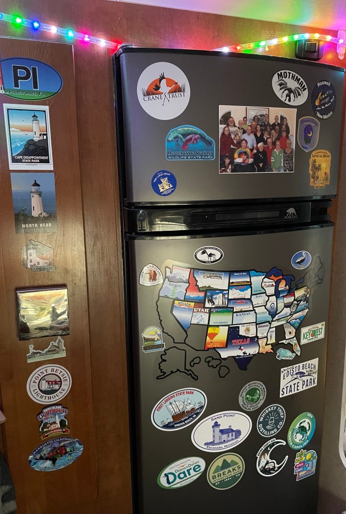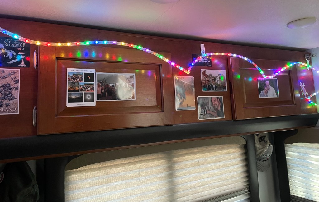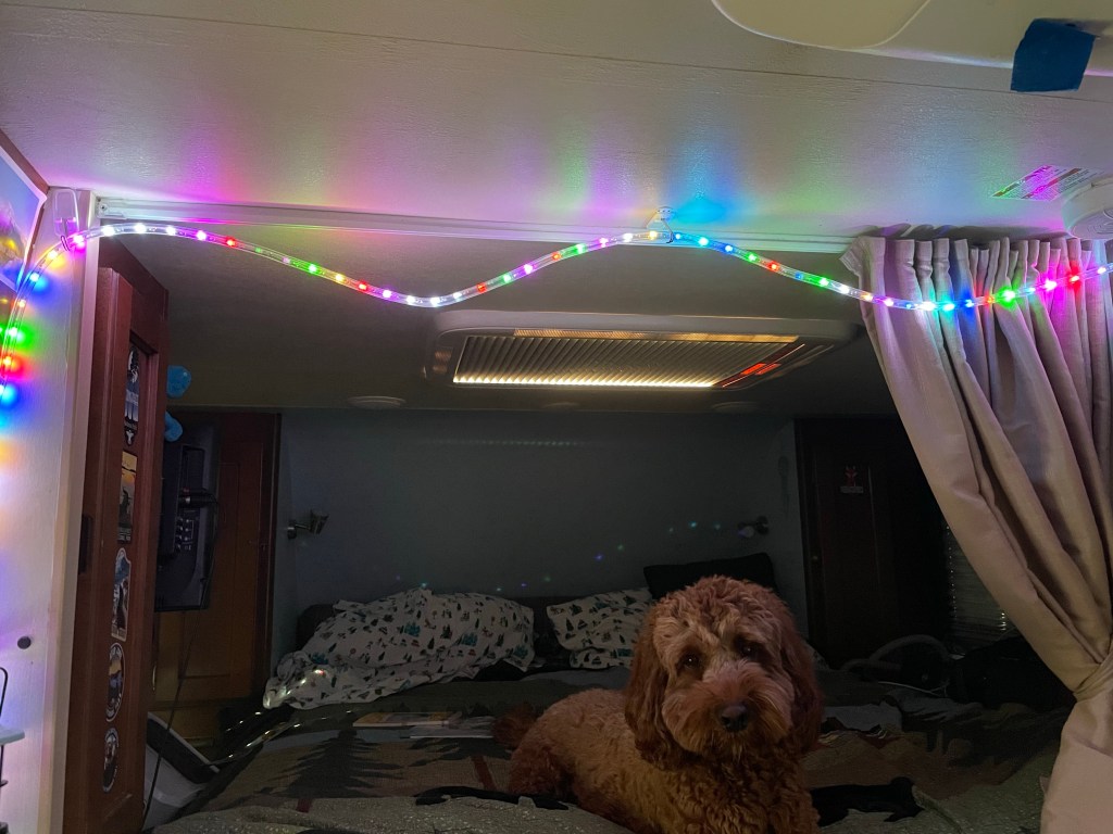 Back at the campground we strung up our new programmable led light rope inside the camper. SO FUN! Simply delightful!