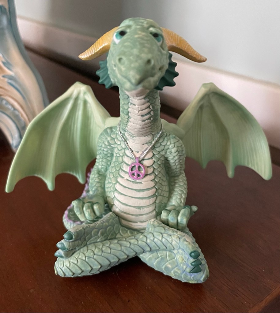 Saturday we were going to American Shakespeare Center to see King Lear but I had screwed up – we were a week late and most annoyingly ASC was unwilling to help out. They said we could BUY two more tickets?! We have season subscriptions for the most expensive seats in the house. I was peeved, so we left and in our wandering around downtown Staunton we spied a Welsh flag flying outside an utterly charming shop! Apparently they have come up with a fabulous way to get people inside 20 little shops – a treasure map to Stauntons dragons!!! Meet our newest dragon!