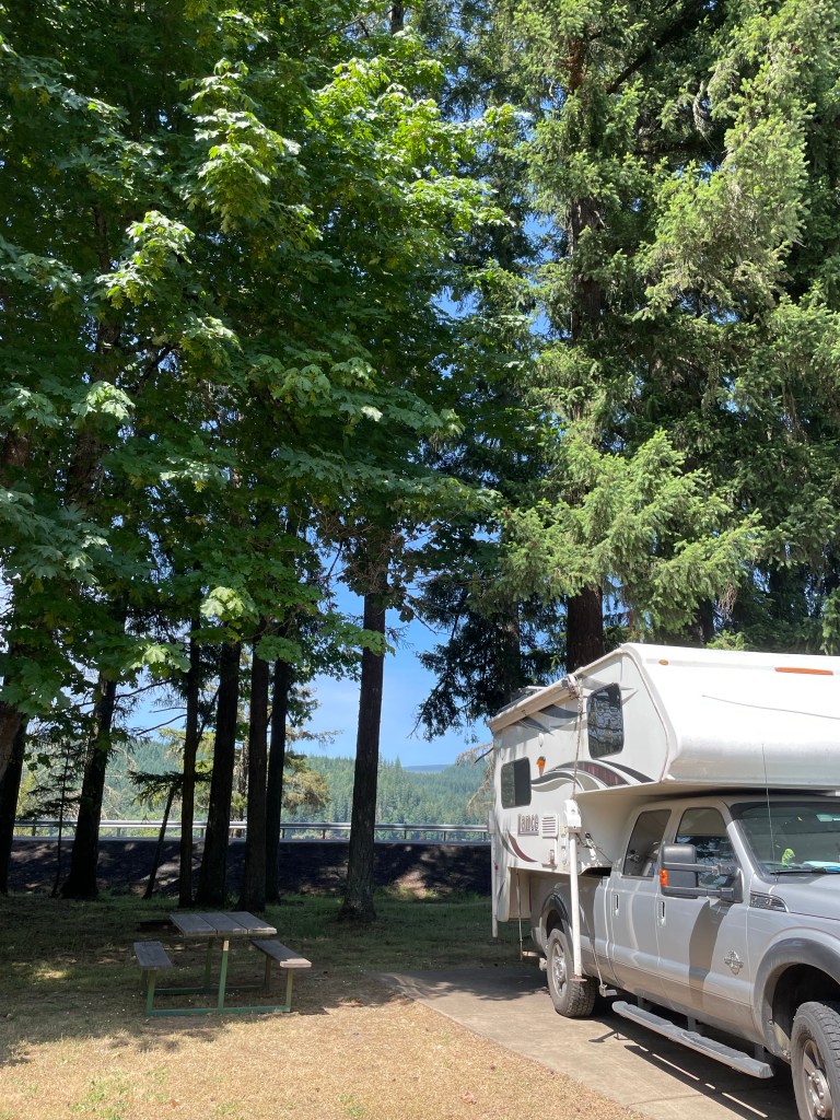 Our final pass of the day was Tombstone, after which was eleven miles of twisty winding 6% descent! Beautiful and slightly terrifying as some switchbacks were labeled as slow as 30 mph! But we reached Sweet Home at last and are currently enjoying cool breezes in the camper at our lovely shaded spot next to the lake.