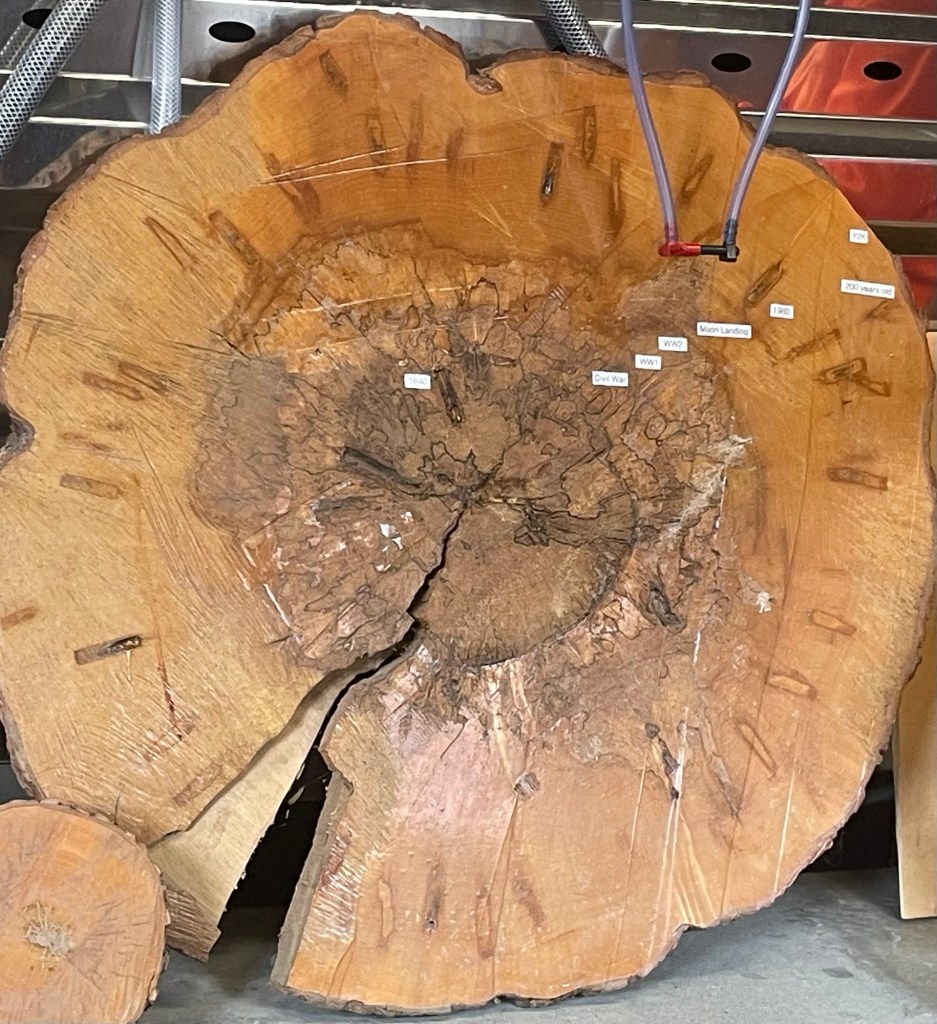 This cross-section of an ancient maple tree shows the scars of every season it was tapped! The tags indicate the eras…