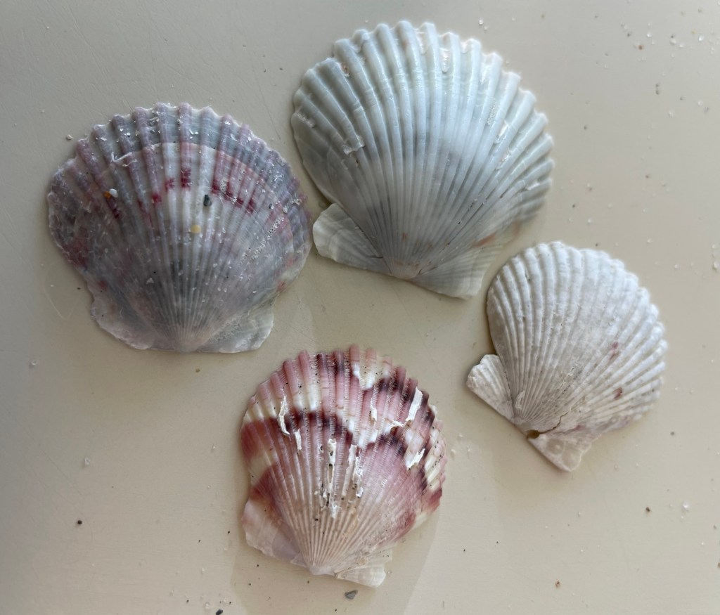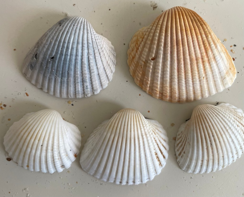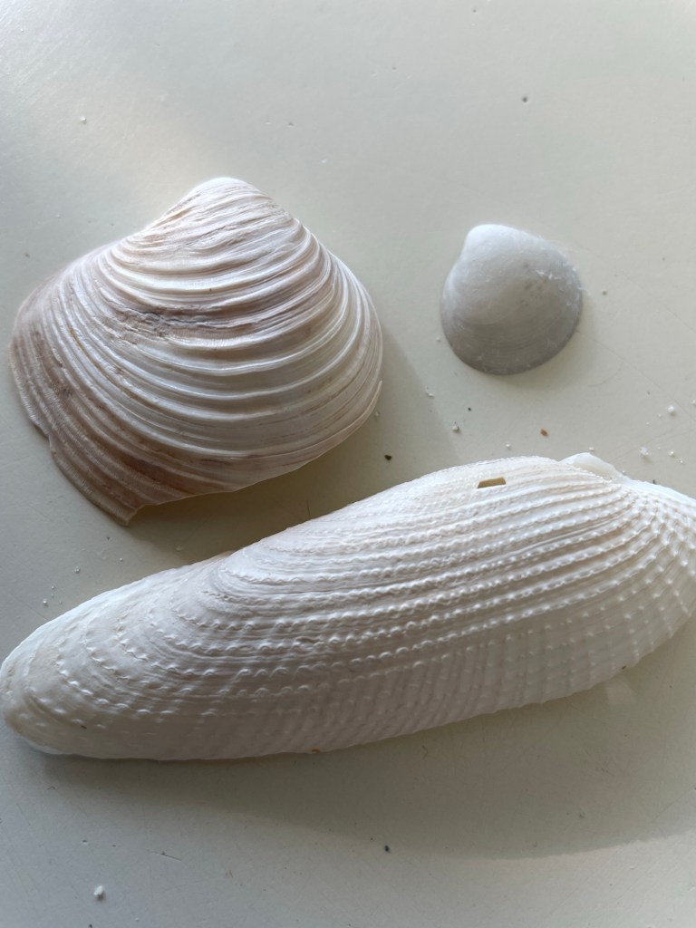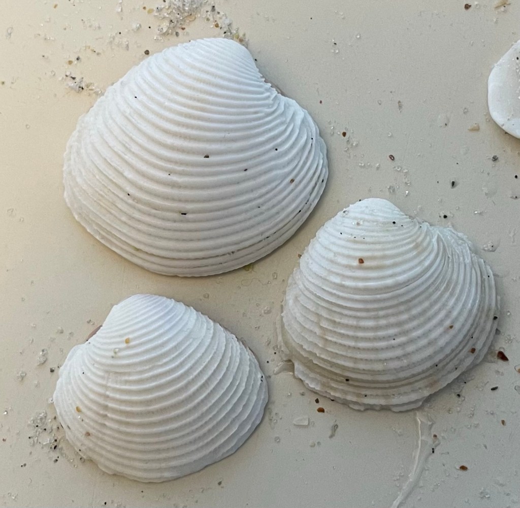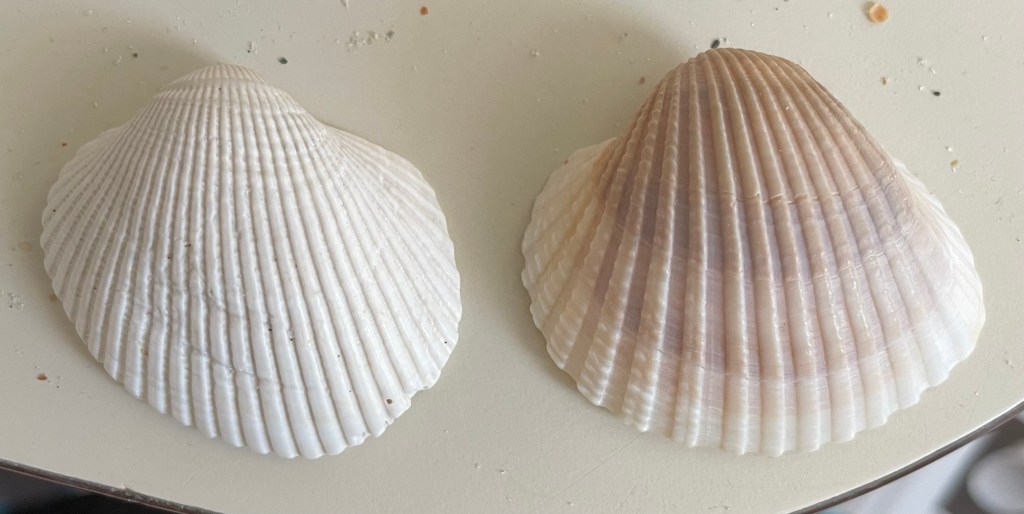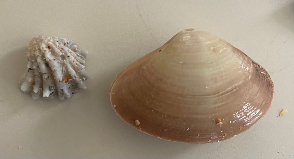 Interesting notes about these two shells. This type clam has radial ribs instead of the growth lines of other clams. And this type scallop has a totally flat top shell!