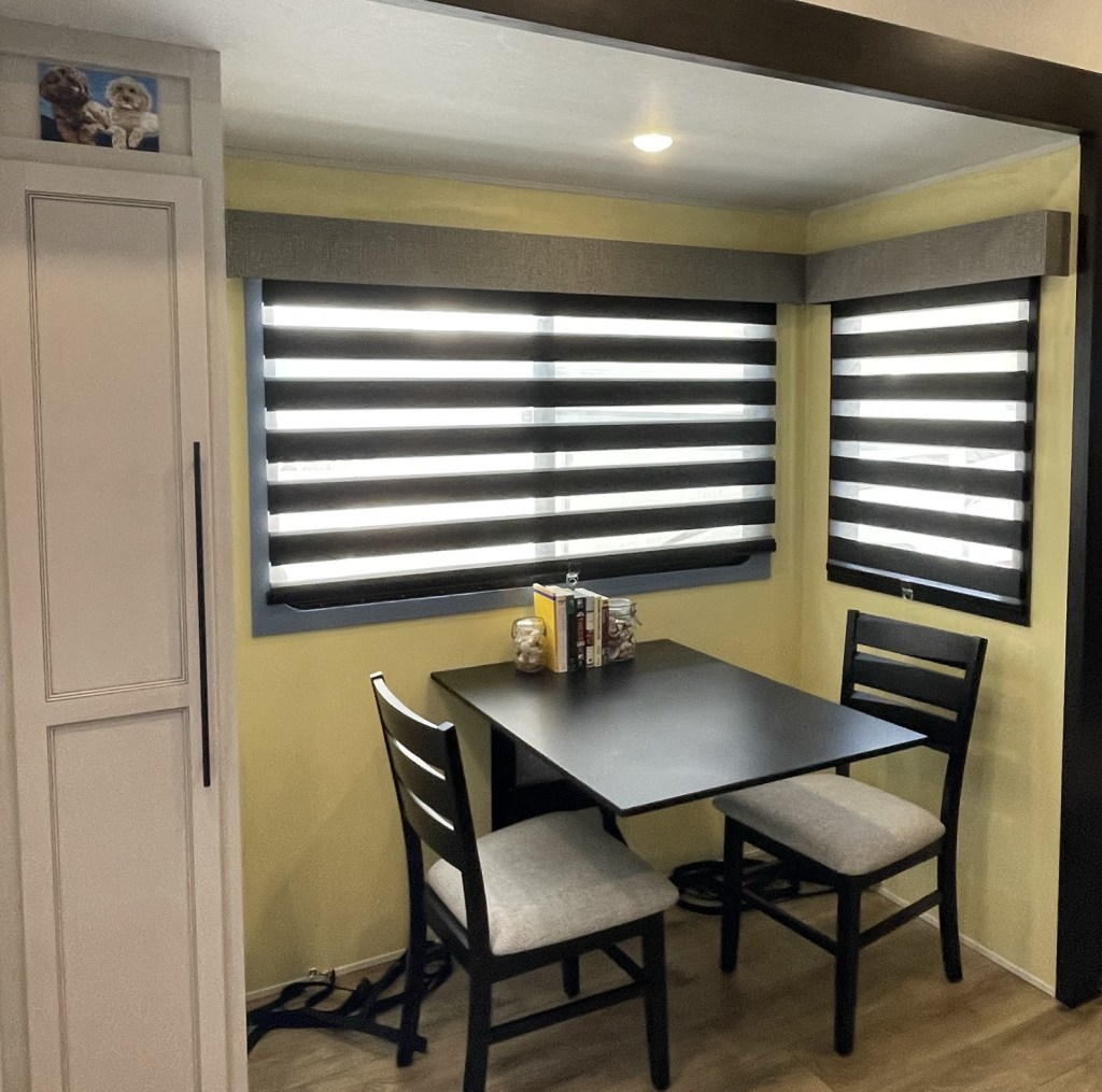 Today we went over to our camper and I started painting! All campers are sold with a nasty beige wall paper which *must* be painted ASAP. So the dining room is now a bright and sunny yellow! The look is finished with a lovely smoky gray blue trim around the windows.