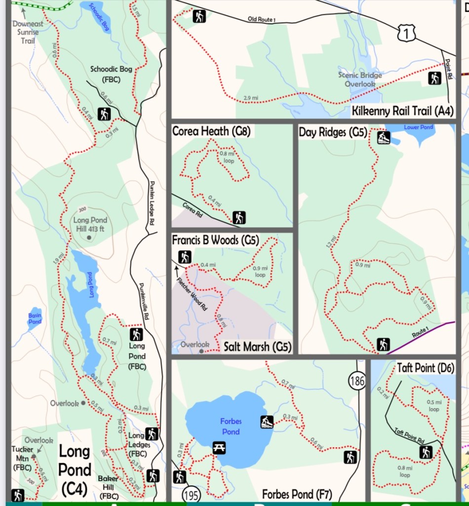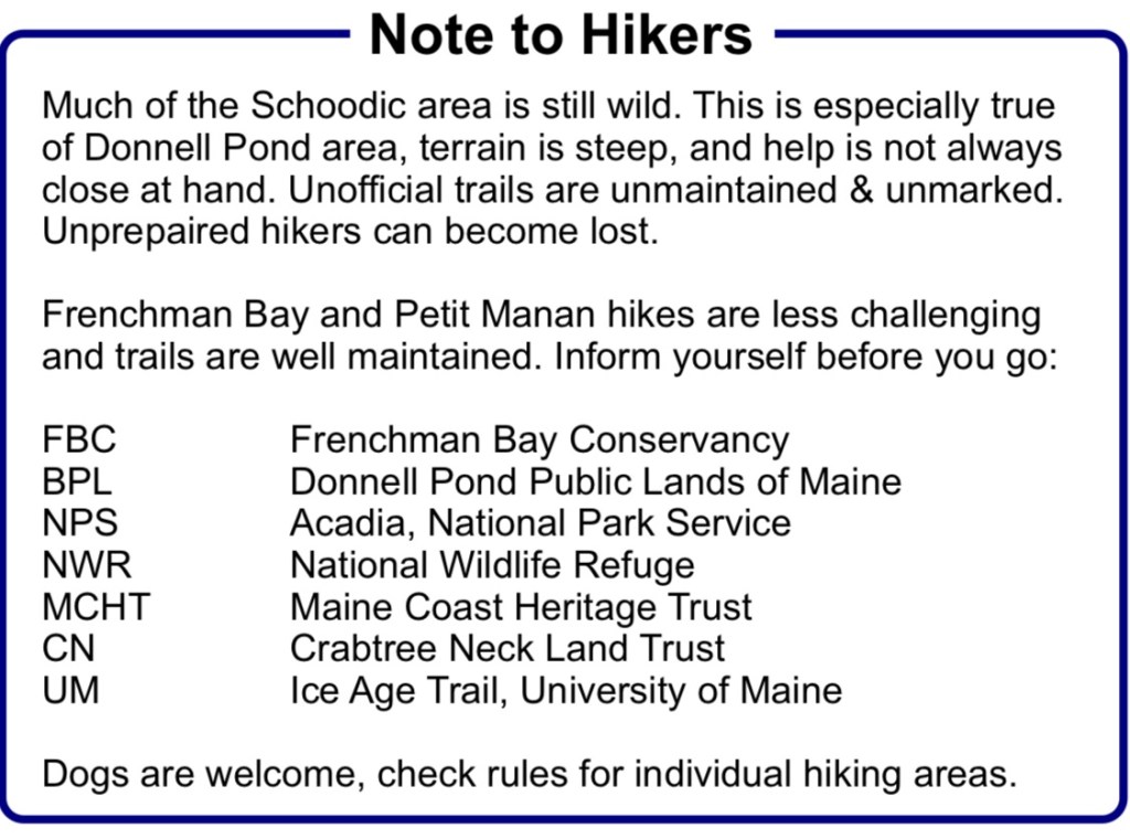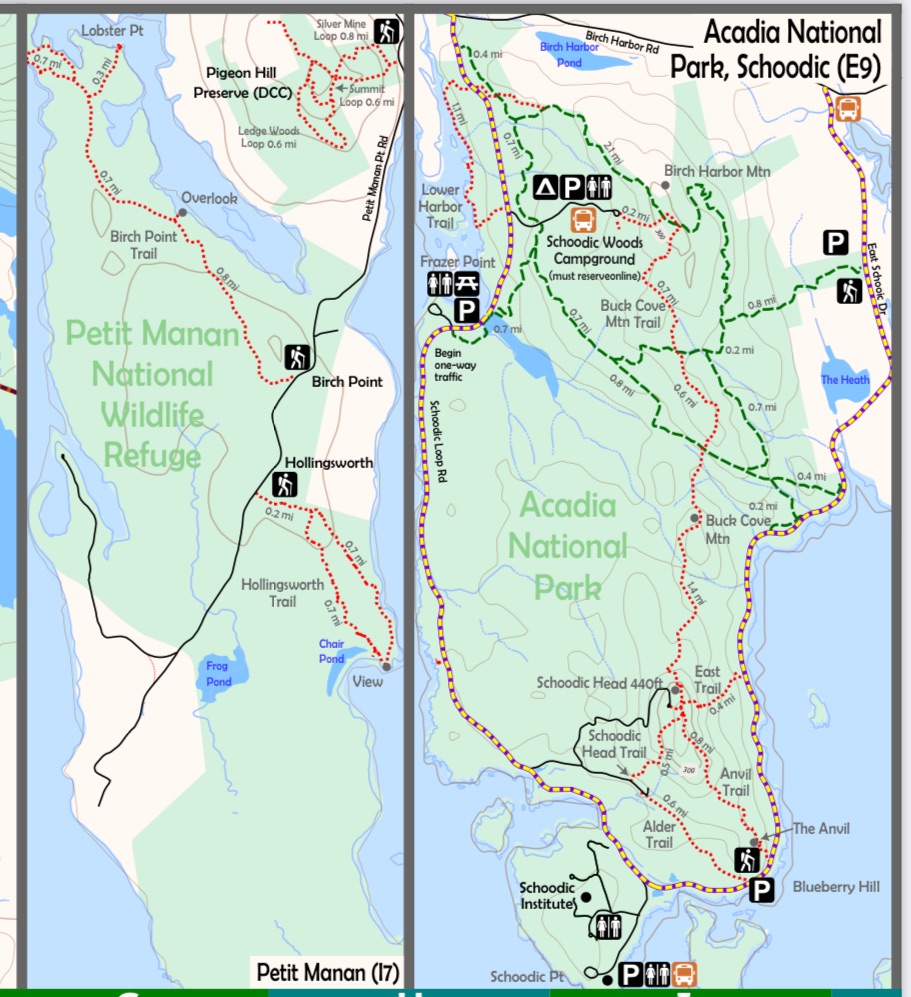 On the Schoodic peninsula there are tons of hiking, biking and kayaking trails. The maps below are copied from Schoodic Chamber of Commerce